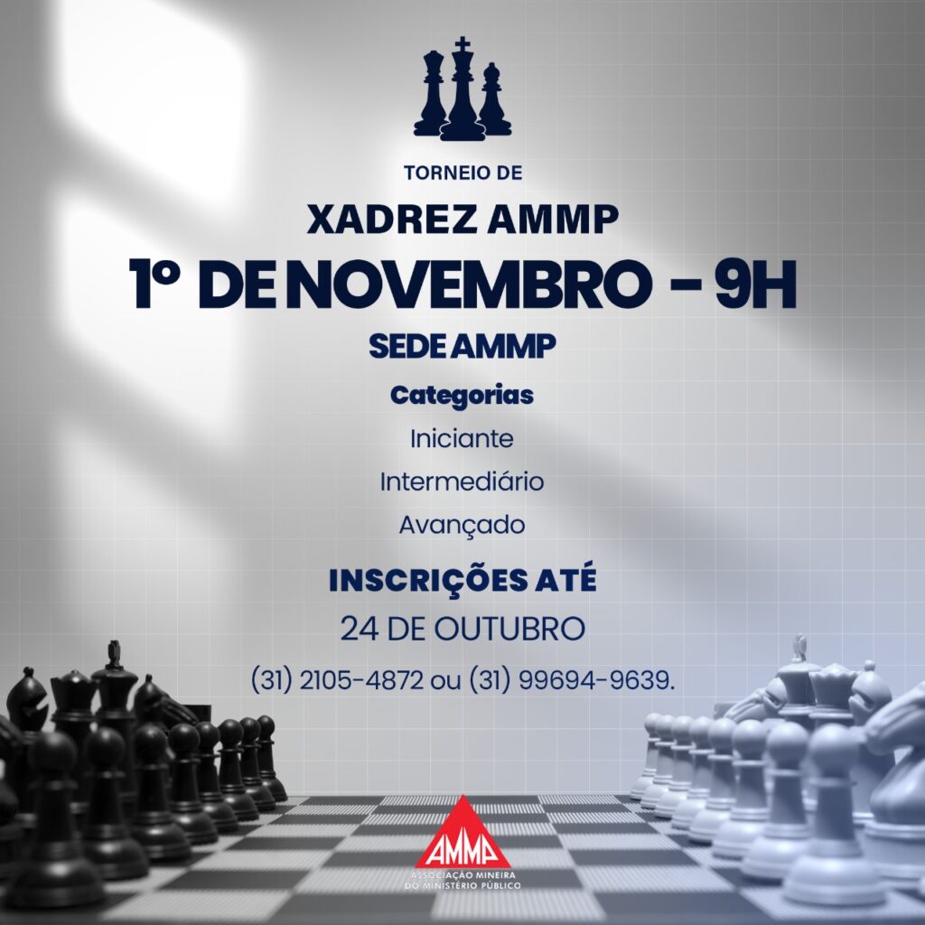 No dia 1º de novembro (sábado), a partir das 9h, acontecerá o Torneio de Xadrez da AMMP 2025, na sede da Associação. A competição contará com as categorias iniciante, intermediário e avançado.