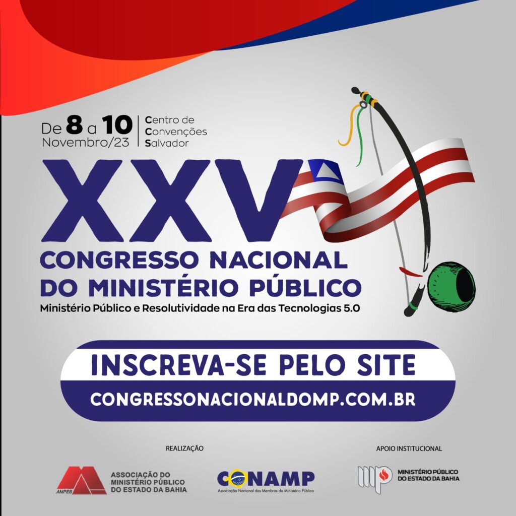 Já estão abertas as inscrições para o XXV Congresso Nacional do Ministério Público, que ocorrerá em Salvador-BA, de 08 a 10 de novembro de 2023, com o tema “Ministério Público e Resolutividade na Era das Tecnologias 5.0”.