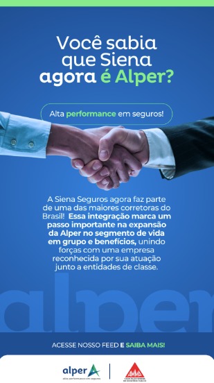 Associado(a), a Siena Seguros está na fase final de integração com a Alper, uma das maiores corretoras do Brasil. A partir de agora, a identidade visual da Siena e os canais de contato com associados(as) e segurados passam a ser representados pelo nome Alper.