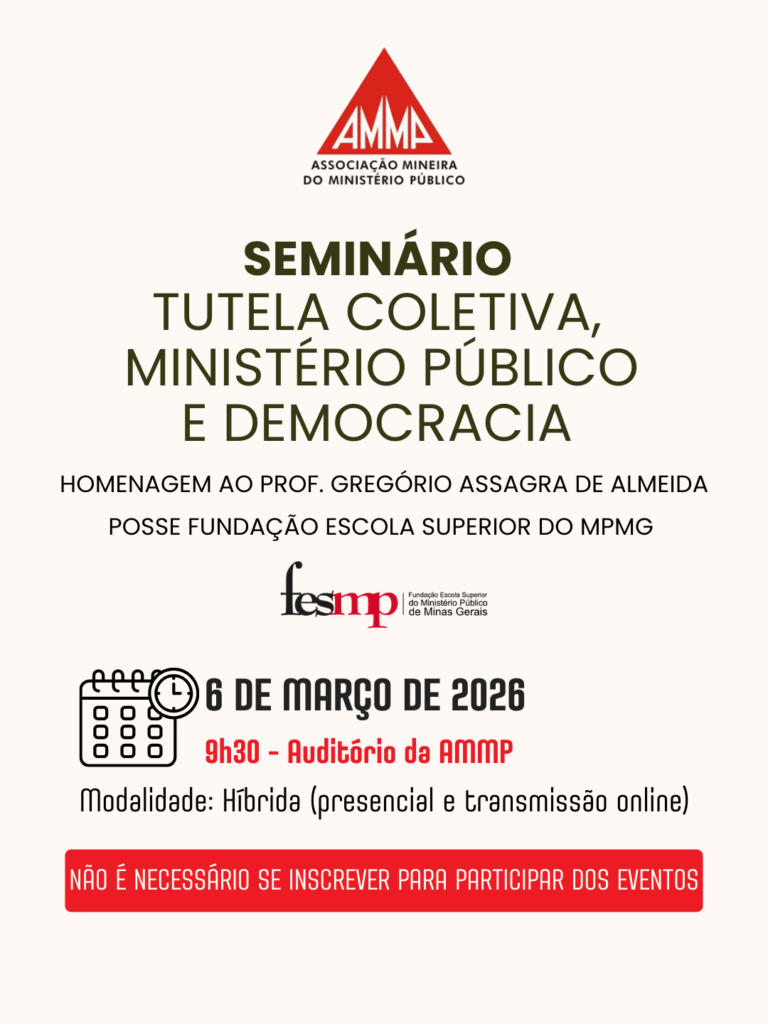 No dia 6 de março, a AMMP promoverá, em seu auditório, o Seminário “Tutela Coletiva, Ministério Público e Democracia”. O evento terá início às 09h30 e será realizado em modalidade híbrida (presencial e transmissão on-line), com uma programação especialmente voltada ao fortalecimento da atuação coletiva e defesa da democracia, pelo Ministério Público.